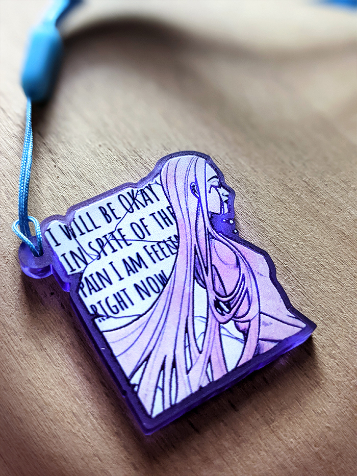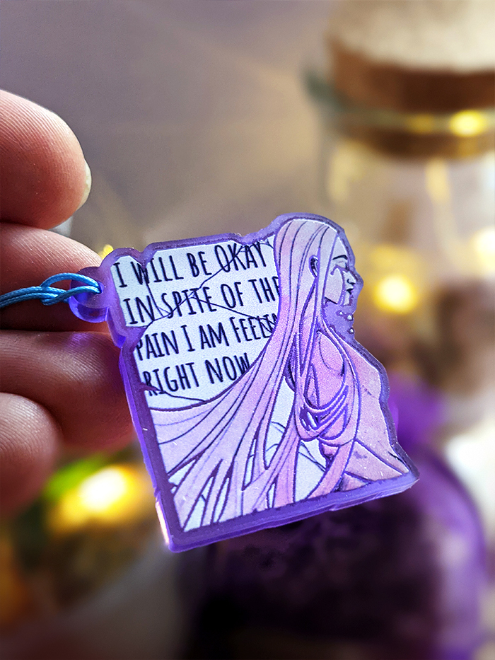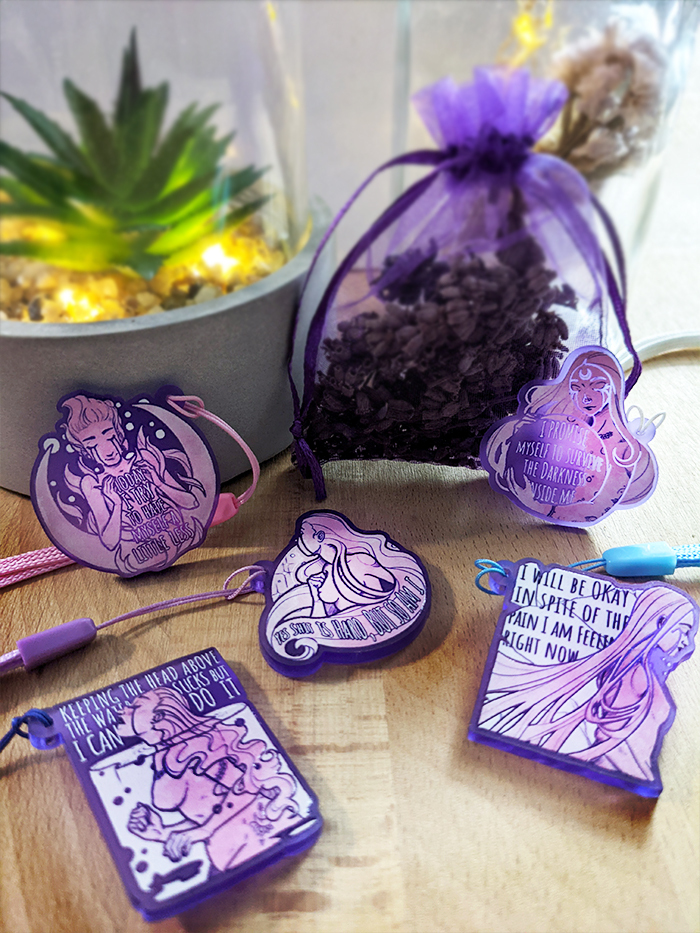 You get one of these limited Edition Mental Health Charms with about 3,5 cm length and a see throw purple finish.